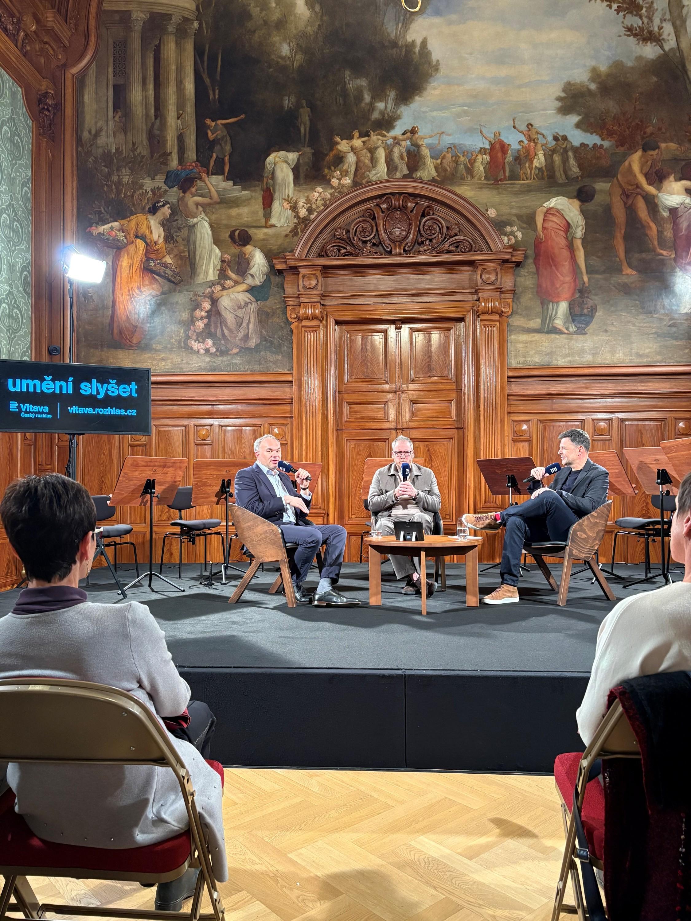 Generální ředitel České filharmonie David Mareček a výkonný ředitel KVIFF Kryštof Mucha v živém vysílání Akcentu v rámci projektu Variace 2025 ze Zanderova sálu v Císařských lázních v Karlových Varech | Foto: Marika Mazáková, Český rozhlas