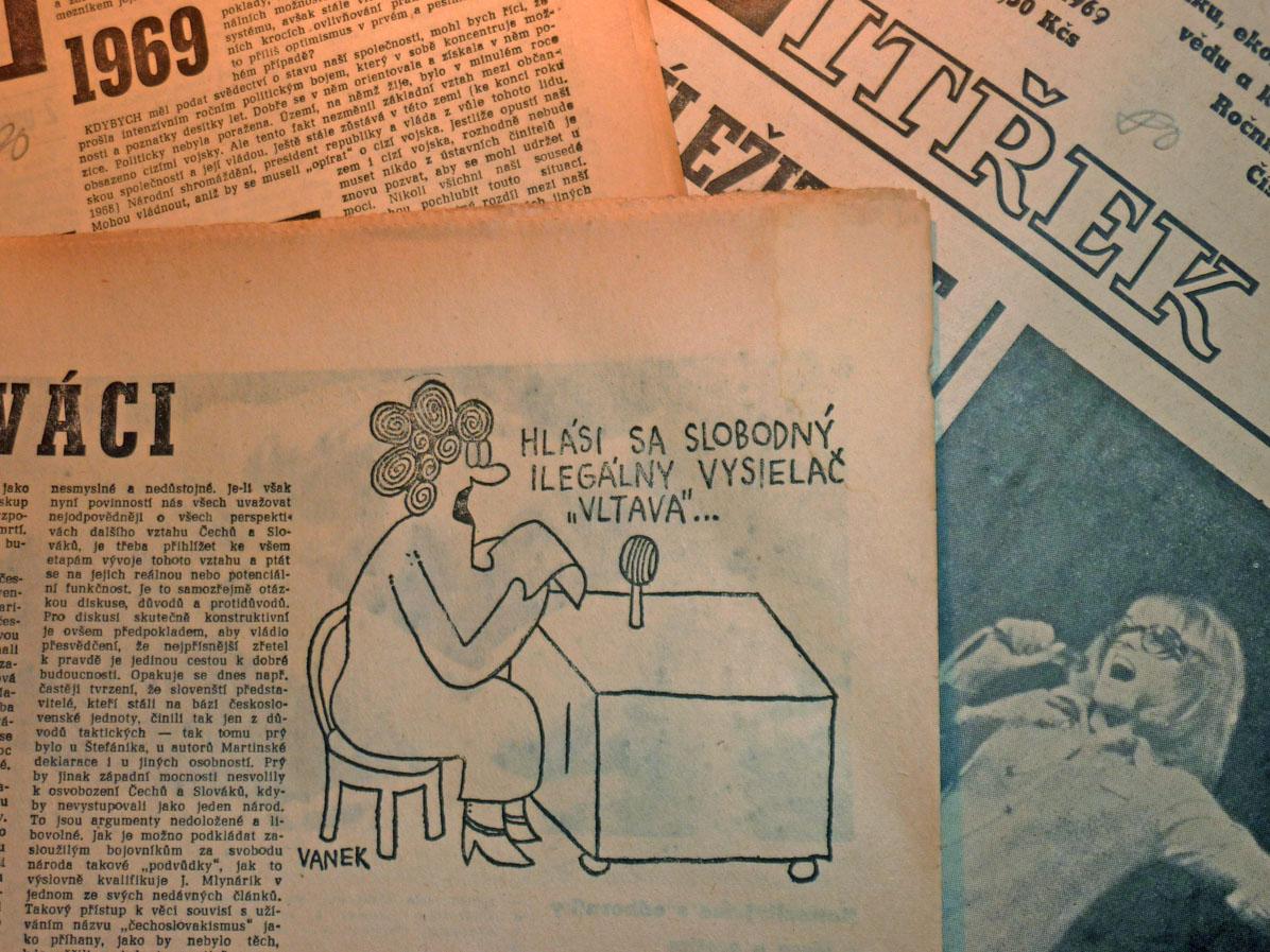 Vysílání Vltavy se stalo terčem mnoha vtipů… Tento je z časopisu Zítřek z ledna 1969, autorem byl slovenský spisovatel a karikaturista Marián Vanek | Foto: David Hertl