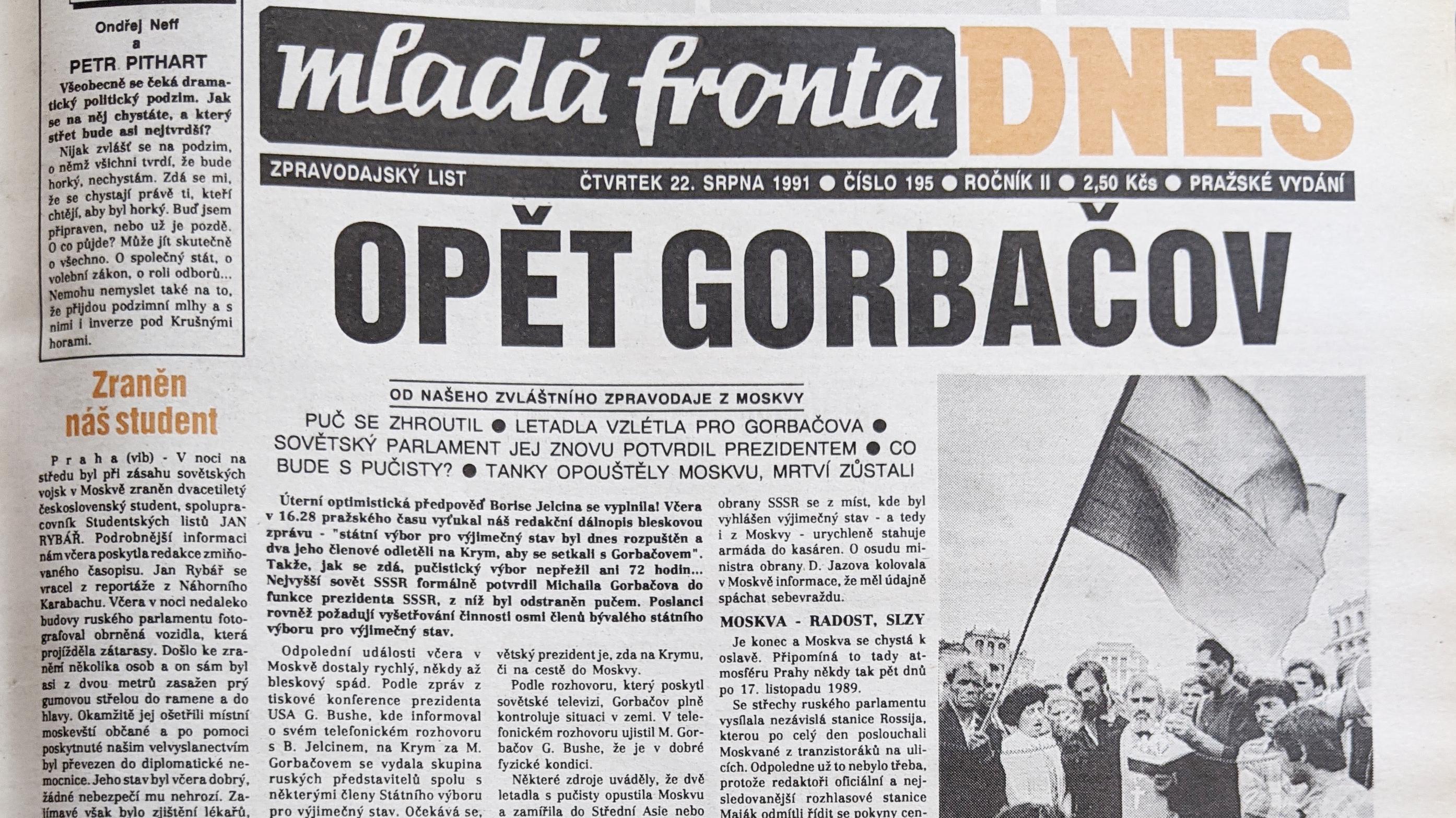 Třetí den už byl krach puče nesporný. Město opustila vojenská technika a Státní výbor pro výjimečný stav se sám rozpustil. Během nočních potyček zemřeli tři lidé. Mezi zraněnými byl i československý student Jan Rybář, později známý novinář. Z Moskvy se hlásí Ján Šmihula (Rozhlasové noviny, 21. 8. 1991).
