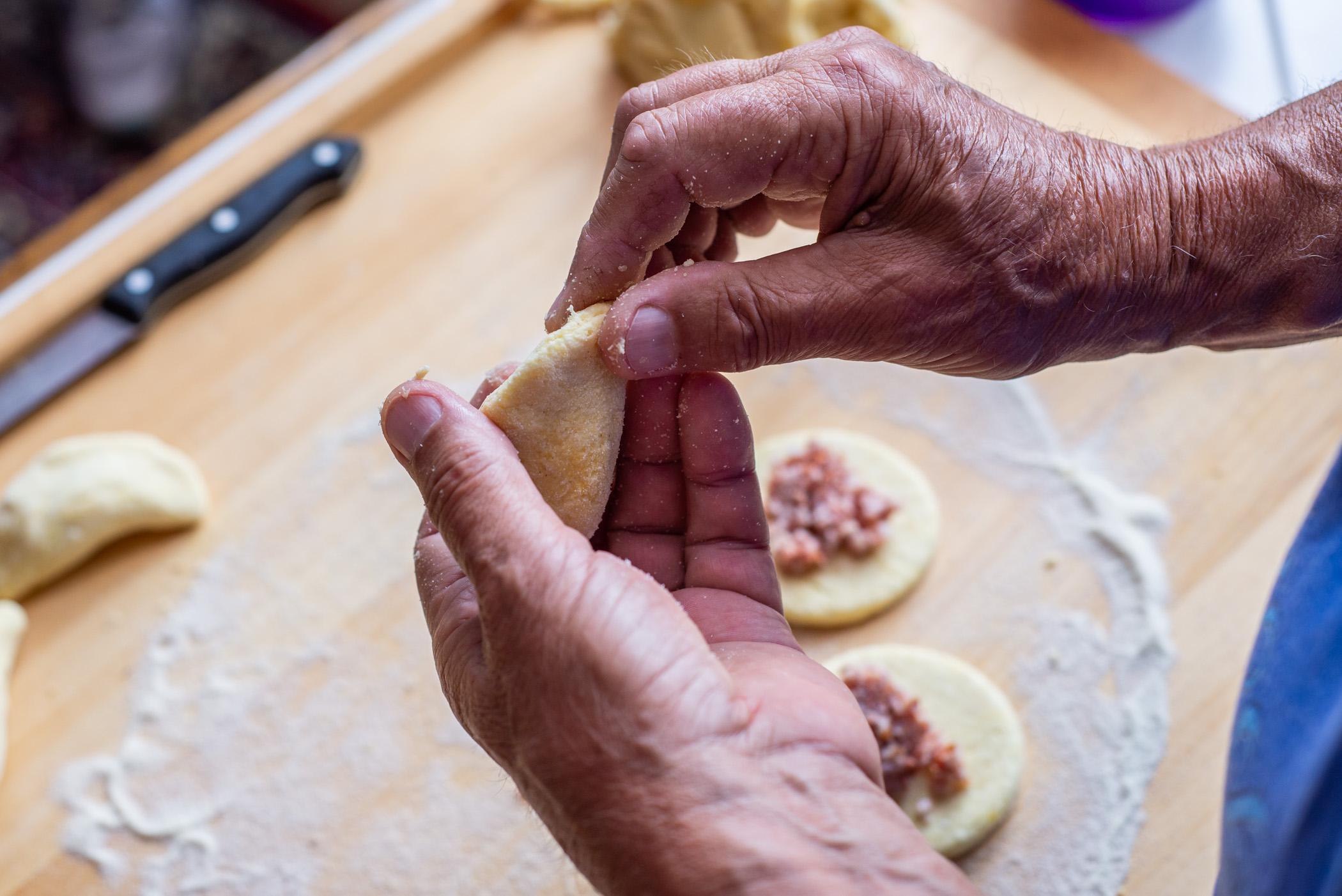 Naplněná kolečka přehneme napůl a vytvoříme taštičku, kterou prsty pěkně utěsníme | Foto: Martin Čuřík