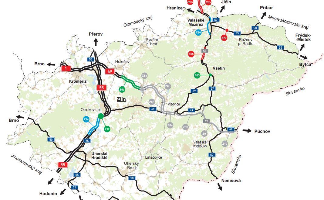 Přehled projektů Ředitelství silnic a dálnic 2025, Zlínský kraj, mapa | Ředitelství silnic a dálnic ČR, ©