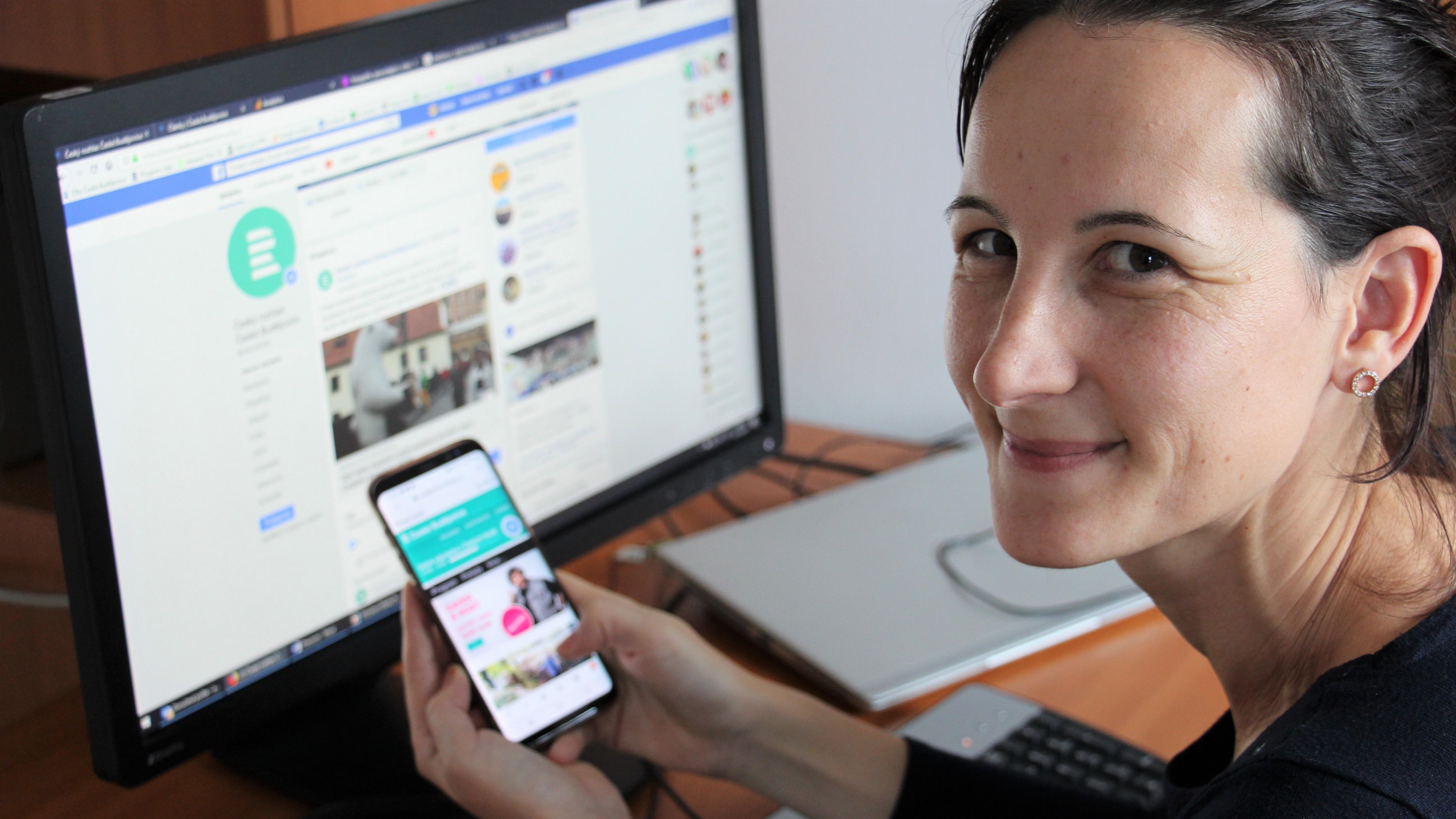 Webeditorka Andrea Poláková ukazuje web Českého rozhlasu na mobilním telefonu a facebookový profil stanice na počítači | Foto: Zdeněk Zajíček, Český rozhlas