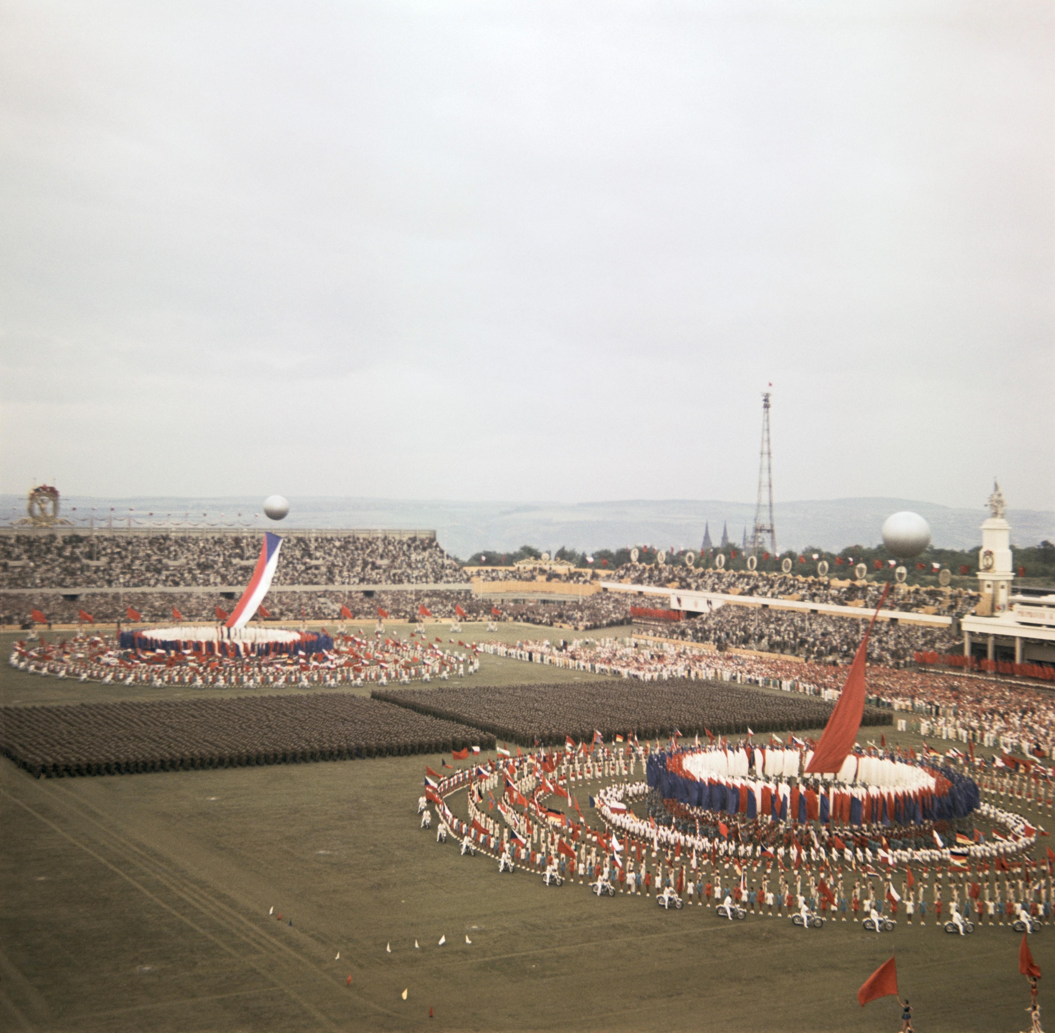 „Rozjásaly se ulice, barvami a krásou se ozdobila Praha. Začaly slavné a krásné dny první celostátní spartakiády. Zde kráčí a zpívá šťastná budoucnost našich národů. Pochodují tisíce cvičenců a cvičenek…,“ oznamoval v roce 1955 nadšený hlasatel filmového týdeníku.