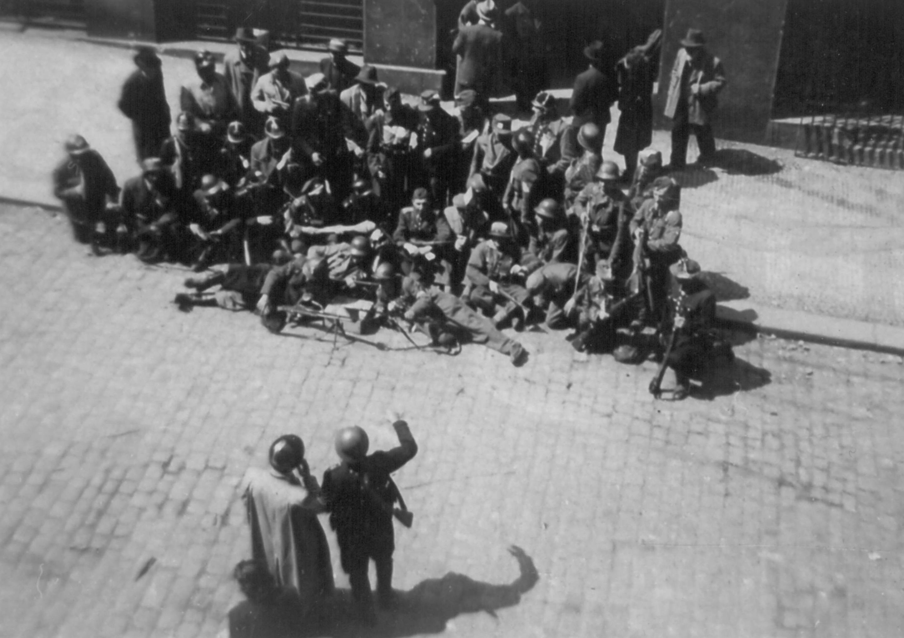Bojovníci rozhlasu před vchodem do budovy, 11. květen 1945 | Foto: archiv Gustava Sklenáře