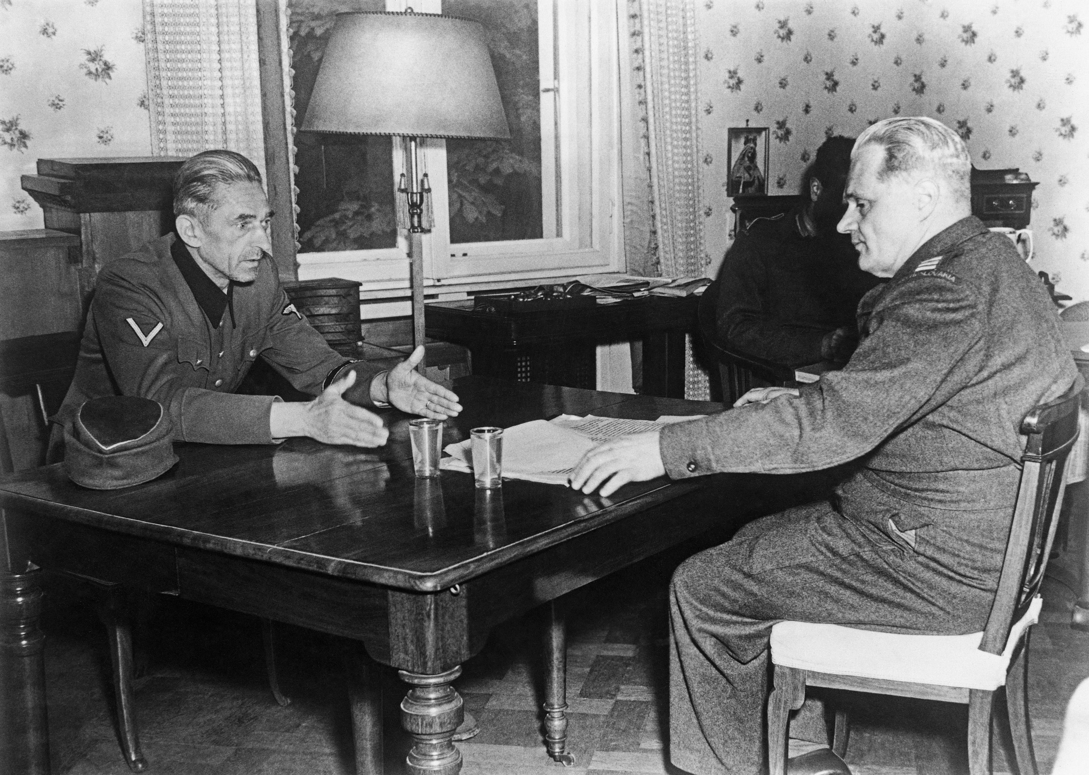 Karl Hermann Frank (vlevo) při výslechu ve Wiesbadenu v 28. května 1945, za stolem vyšetřovatel Bohuslav Ečer | ČTK