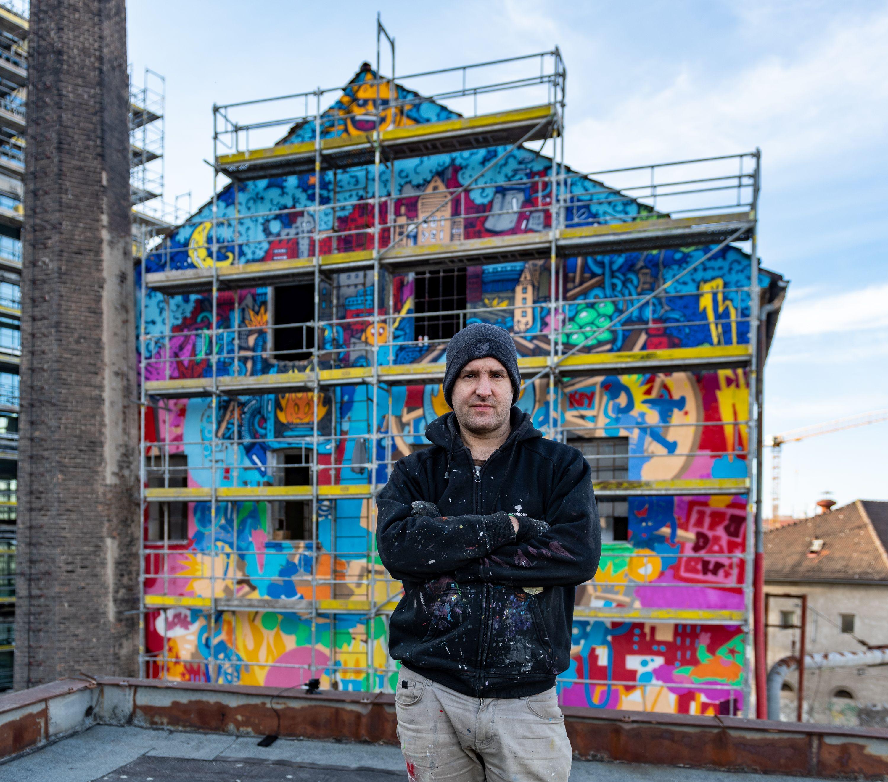 Před halou u letiště Michal Škapa výtvarně pojal budovu Vlněny Brno | archiv CTP