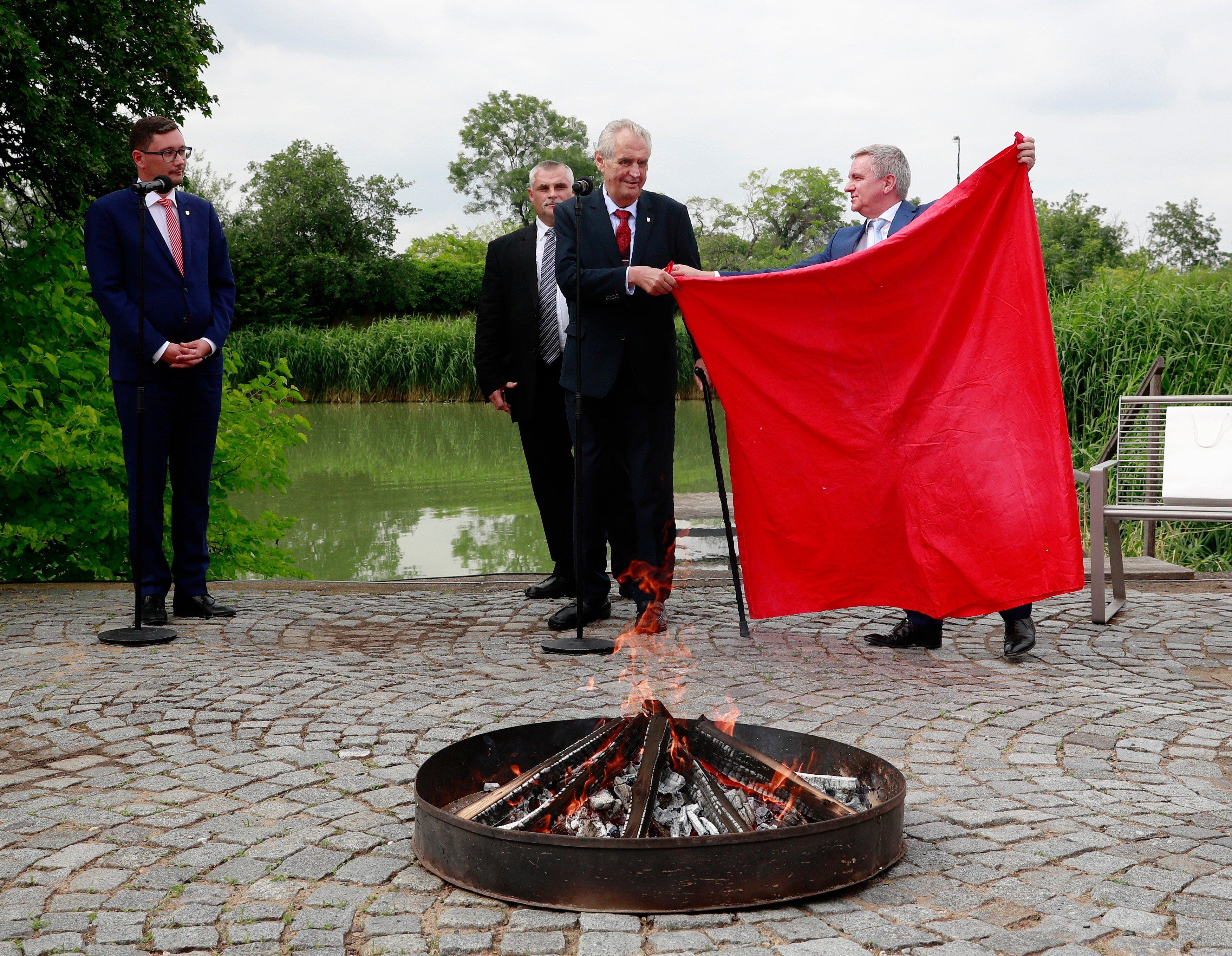 Prezident Miloš Zeman a kancléř Vratislav Mynář při pálení rudých trenek skupiny Ztohoven na Pražském hradě | Profimedia