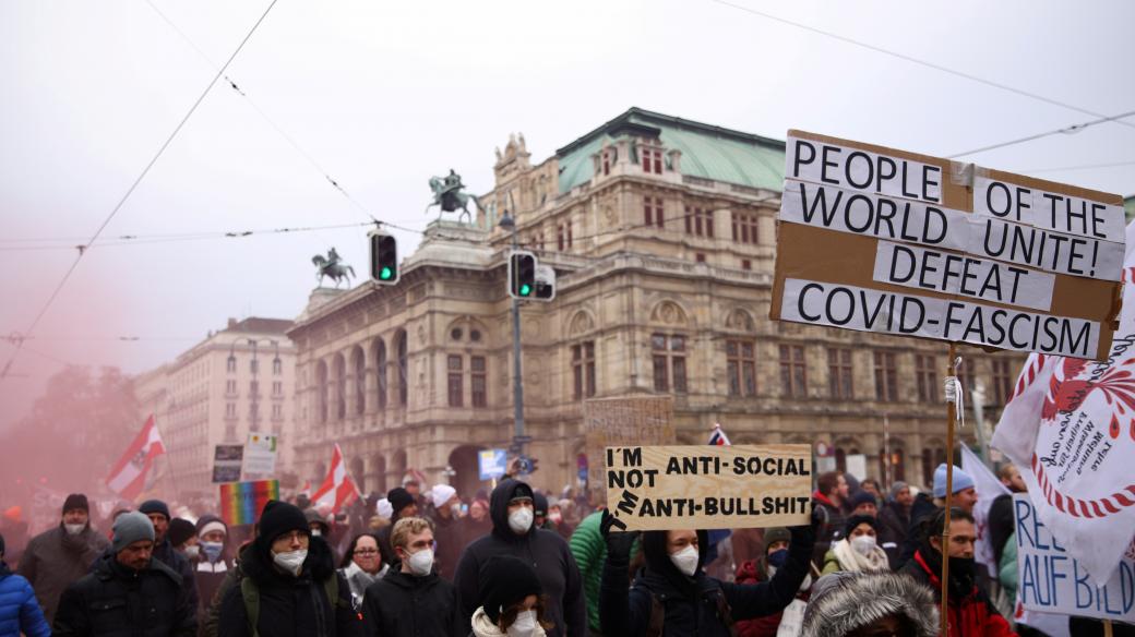 Protestující ve Vídni nesli plakáty s nápisy jako „Rozhodnu se sám za sebe“ nebo „Nové volby“, kterými dávali najevo svůj postoj k očkování i nynější koaliční vládě lidovců a Zelených | Reuters