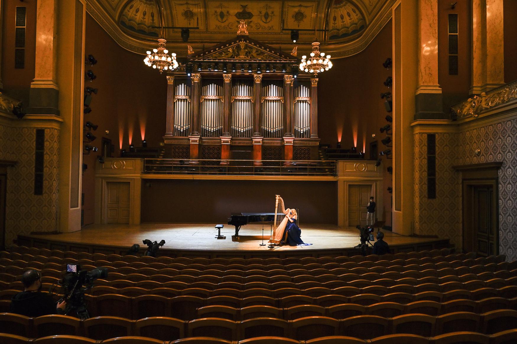 Hudebníci České filharmonie vystoupili v pražském Rudolfinu na benefičním koncertu pro dvě pražské a dvě brněnské nemocnice bojující s epidemií koronaviru. Kvůli zákazu pořádání společenských akcí hráli před prázdným hledištěm | Česká filharmonie