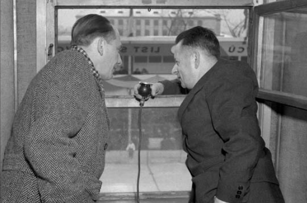 přenos se vším všudy se do éteru dostal 3. října 1926. Šlo o fotbalové utkání SK Slavia-Hungaria Budapešť. Komentoval ho legendární Josef Laufer (1891–1966). Snímek je pozdější. Na začátku roku 1947 se v Praze konalo Mistrovství světa v hokeji. Komentují Josef Laufer (vlevo) a Štefan Mašlonka (1920–2000). A tehdejší nejmodernější technika? Mikrofon – a otevřené okno.
