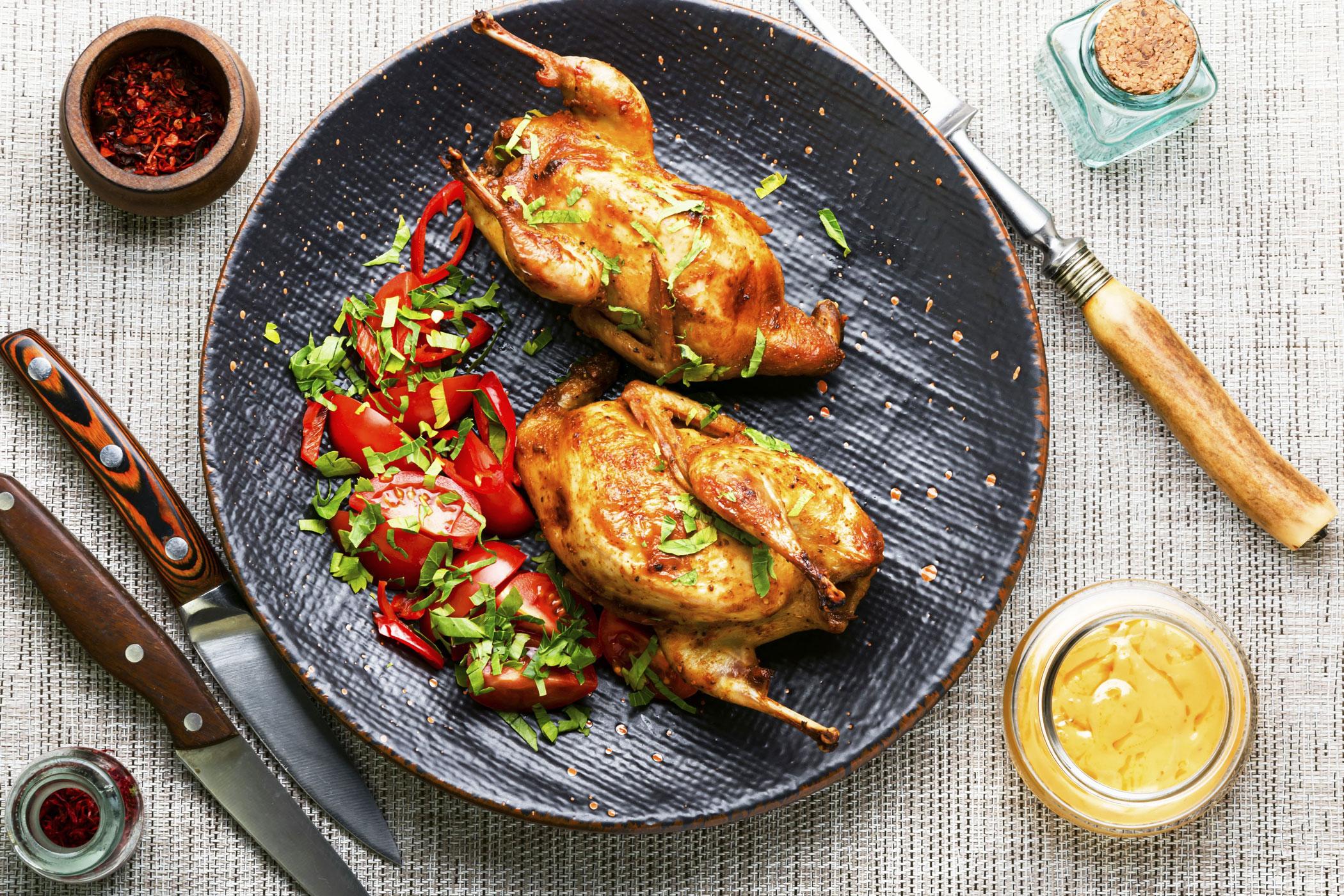 Křepelky jsou nízkotučné, stejně jako každá zvěřina. Pečou se jen čtvrt hodiny. S čím je servírovat? Exkluzivně pro stanici Český rozhlas Dvojka připravil Roman Paulus.