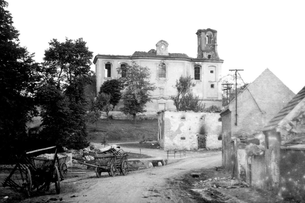 Pohled na střed vypálených Lidic s kostelem sv. Martina 11. června 1942 (unikátní snímek pořízený tajně českým četníkem Josefem Sýkorou) | Foto: z archívu Vojenského historického ústavu a Eduarda Stehlíka