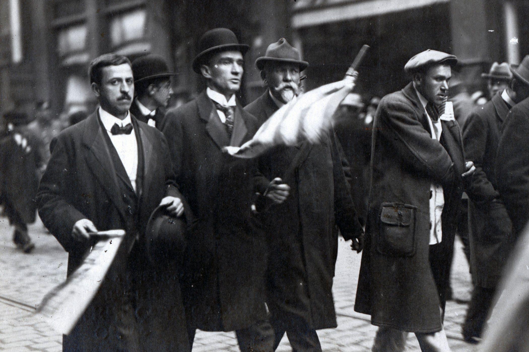 Herec a písničkář Karel Hašler (s buřinkou na hlavě a vlajkou) v čele průvodu | Foto: Fotobanka Profimedia