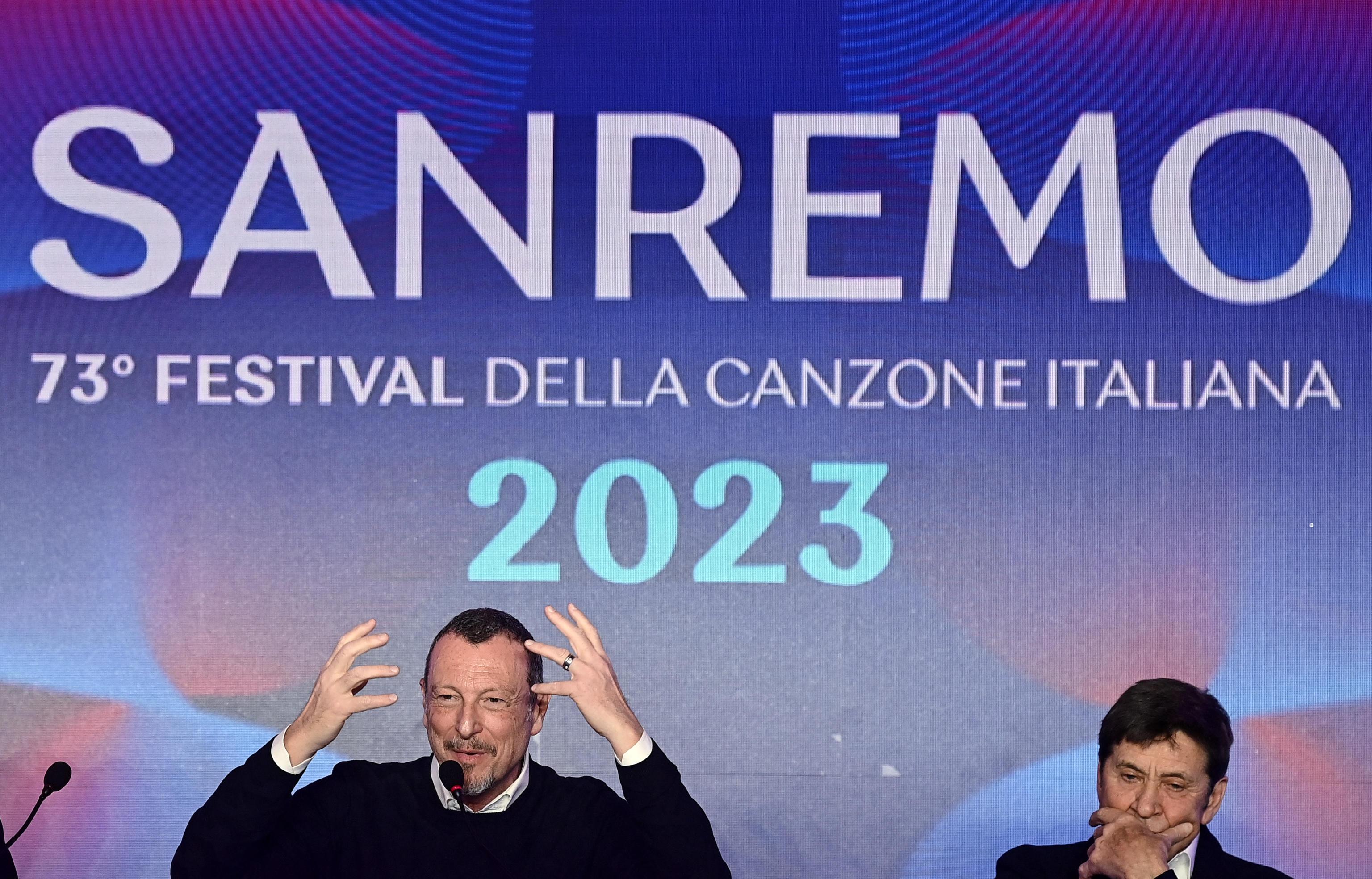 Festival Sanremo 2023, vlevo umělecký ředitel festivalu Amadeus, vpravo zpěvák Gianni Morandi | Fotobanka Profimedia