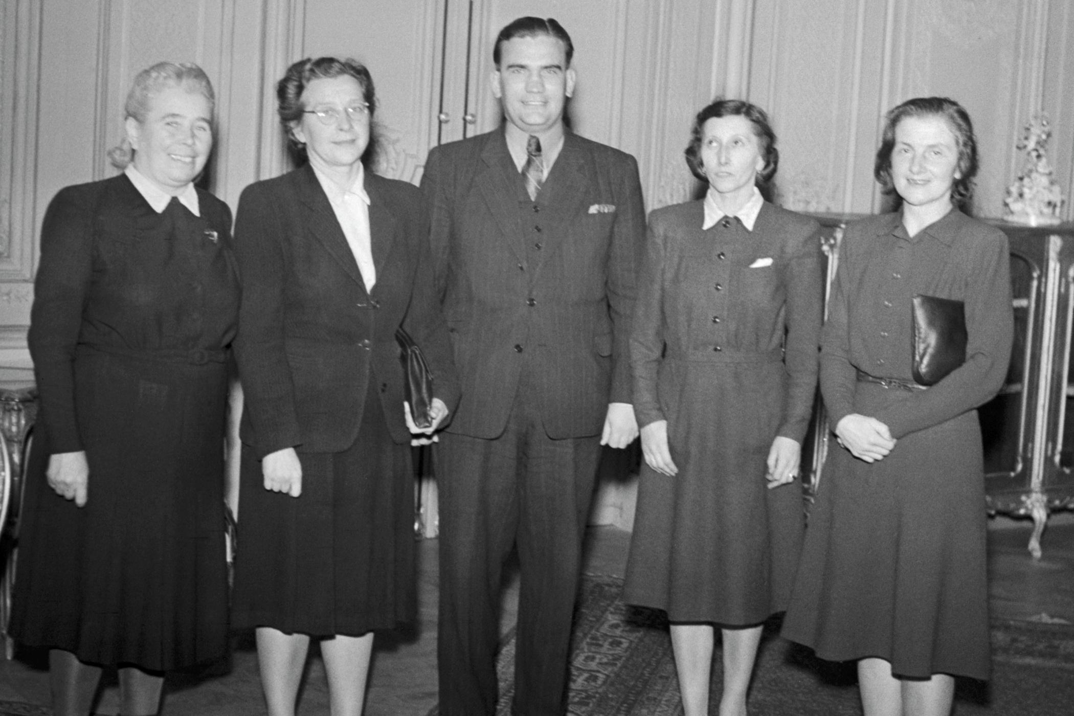 Zleva poslankyně Barbora Škrlantová, Milada Horáková a legační tajemník Nivikov, další členka delegace dr. Čermáková a neidentifikovaná žena při předání pozdravné ardesy československých žen ženám SSSR k 30. výročí SSSR v roce 1947 | Foto: Věněk Švorčík, ČTK