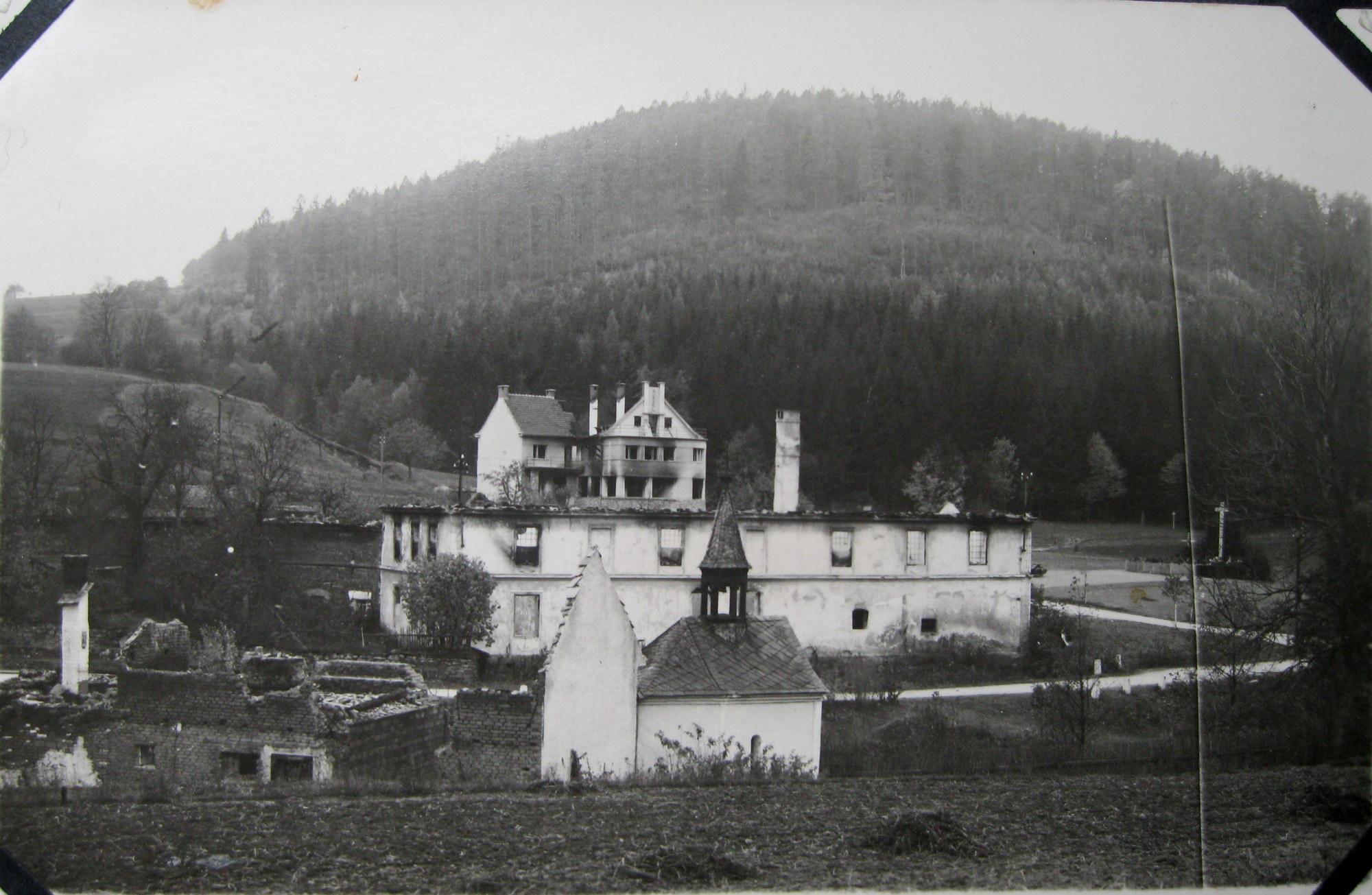 Největší statek Jaroslava Dokoupila. V pozadí vypálený hotel Adolfa Pospíšila | Post Bellum