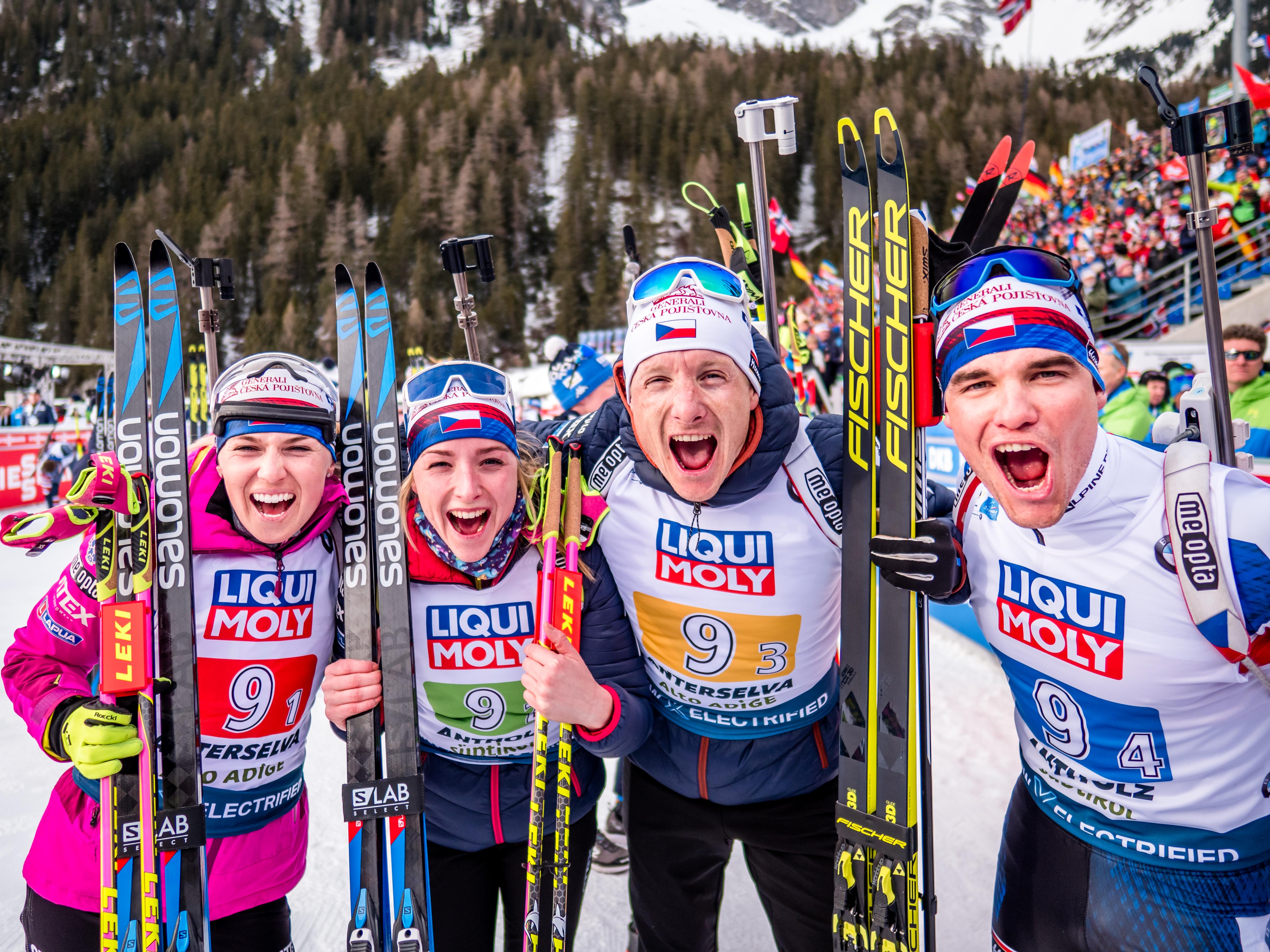Česká smíšená štafeta. Zleva: Eva Kristejn Puskarčíková, Markéta Davidová, Ondřej Moravec, Michal Krčmář. | Foto: (C) Český biatlon, Petr Slavík, Český biatlon