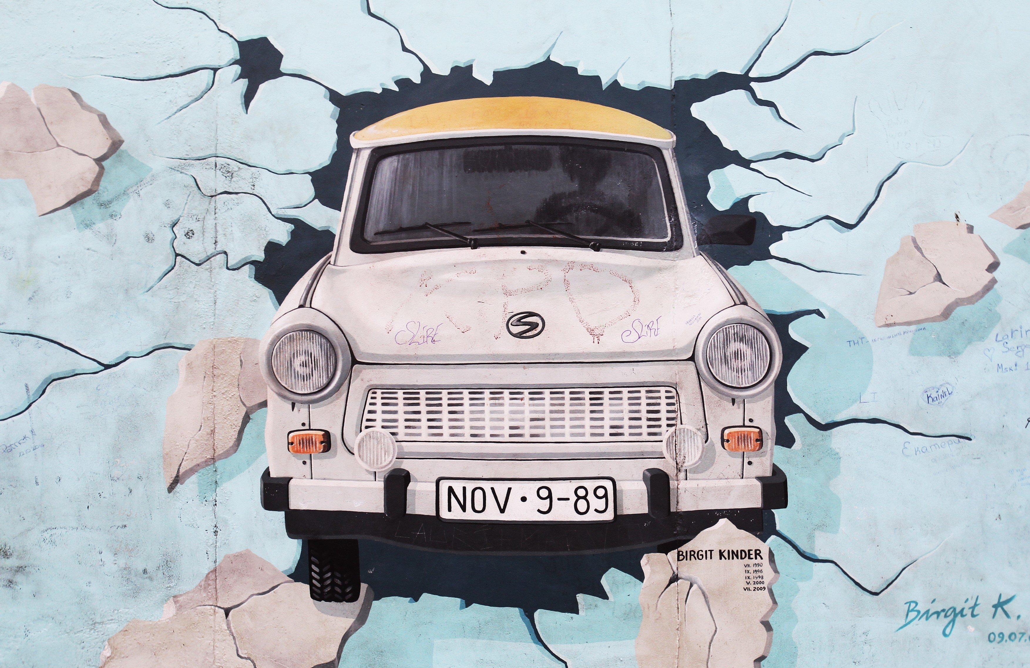 Legendární trabant z NDR vyobrazený na Berlínské zdi | Profimedia