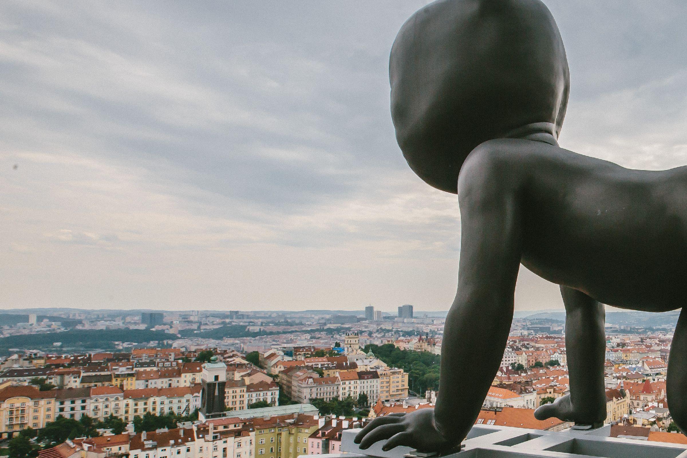Praha pohledem mimina sochaře Davida Černého na Žižkovském televizním vysílači | Foto: Jana Volková
