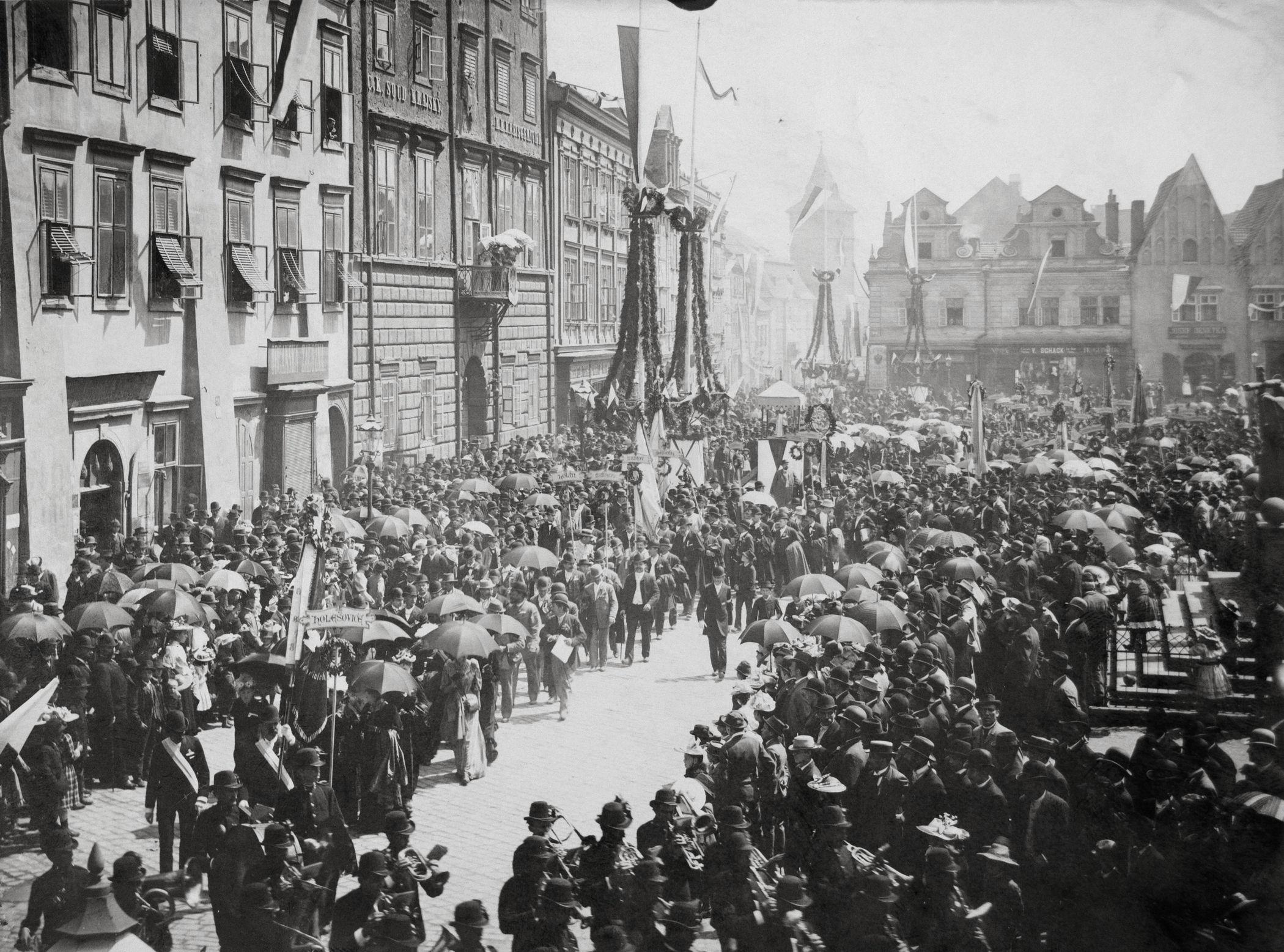 Příležitostné alegorické stavby, vlajkosláva, hudba a průvody, byť méně nákladné, tvořily kulisu mnoha dalších oslav; zde například při svěcení praporu Hlaholu v roce 1893 | Foto: ZČM v Plzni - národopisné oddělení