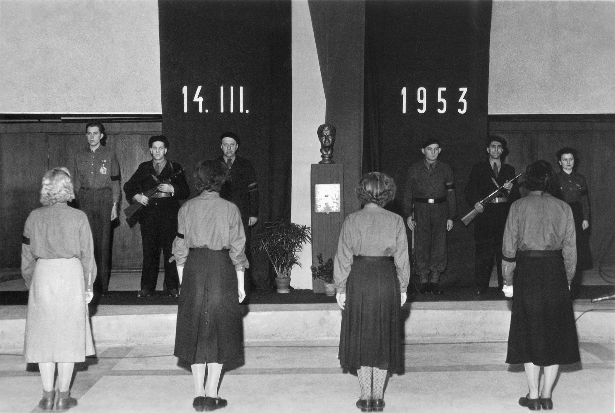 Ukázka toho, čím byly nahrazovány reportáže, které rozhlas v 50. letech přestal vysílat. Projevy předsedy vlády Širokého a ministra kultury Kopeckého doprovodily slavnostní odhalení monstrózního sousoší na Letné rok před tím, než tajemník ÚV KSSS Chruščov poodhalil a odsoudil diktátorské praktiky svého předchůdce Stalina a s ním související kult osobnosti. To byl hlavní důvod, proč byl pomník, přezdívaný „fronta na maso“ už za sedm let, v roce 1962, odstraněn.