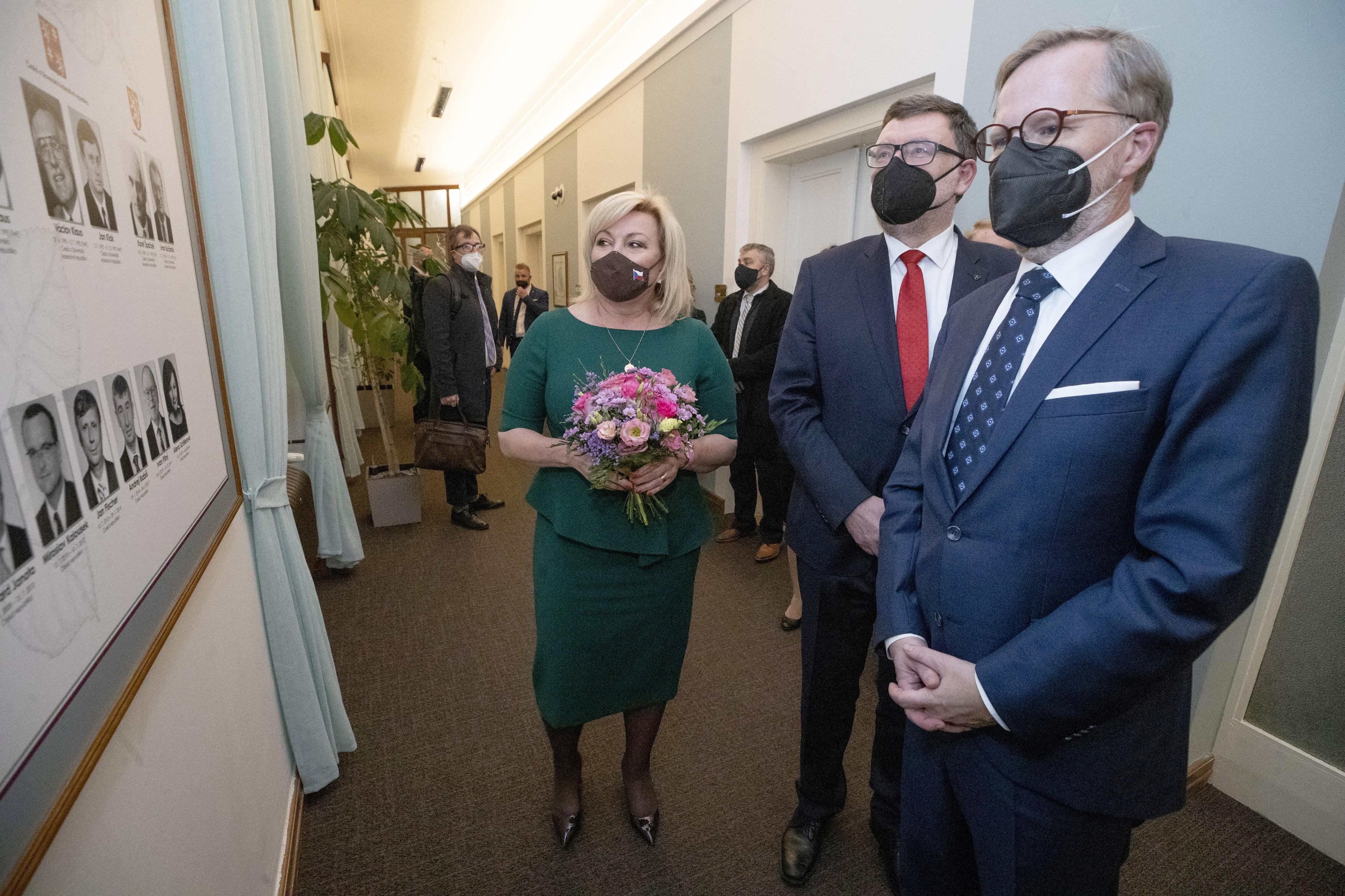 Předávání ministerstva financí: Alena Schillerová (ANO), Zbyněk Stanjura a Petr Fiala (ODS) | Foto: Jakub Stadler, MAFRA / Profimedia