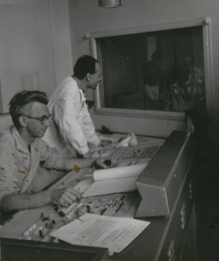 Otakar Bílek (vlevo) v režii Československého rozhlasu České Budějovice se zvukařem M. Vaverkou (r.1965) | Foto: Archiv Českého rozhlasu