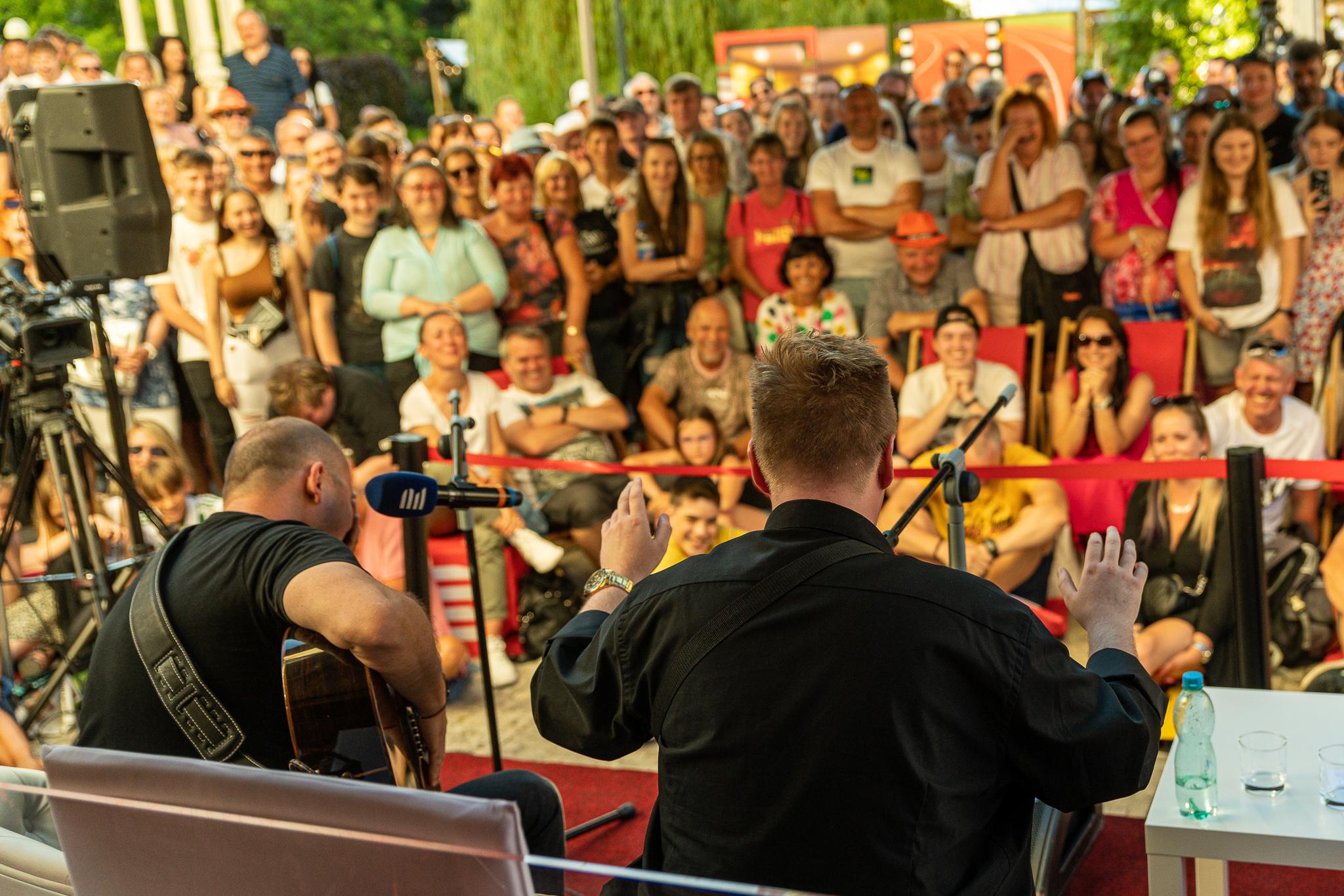 Velká show v podání herců a muzikantů Štěpána Kozuba a Jiřího Krhuta ukončila na karlovarském filmovém festivalu Den s Českým rozhlasem. Oba baviči nešli pro výraz daleko, jak je u nich v Ostravě dobrým zvykem. A diváci se náramně bavili. Bylo jich na malém prostoru u Sadové kolonády několik set, převládaly ženy, kupodivu tam bylo také dost dětí. I když našli se i horníci.