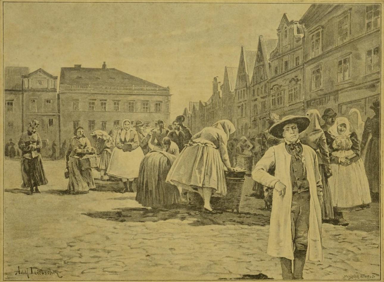 Trhy v Plzni byly událostí, která město vyvedla z poklidného rytmu. Reprodukce obrazu Adolfa Liebschera Trh na náměstí v Plzni, 1897 | Národopisné muzeum Plzeňska / Západočeské muzeum v Plzni