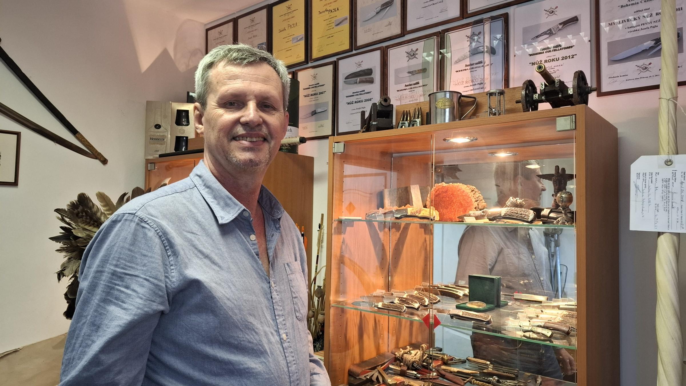 Nožíř Josef Pajl vyrábí nože už 44 let. Nože miluje už od dětství, neobešlo se to ale bez četných jizev na rukách. Ty ostatně přibyly i ve chvíli, kdy je začal v roce 1990 profesionálně vyrábět. Důležitým mezníkem bylo, že si osvojil původní způsob řemeslné výroby a začal vyrábět čepele nožů z vlastní uhlíkaté damascénské oceli.