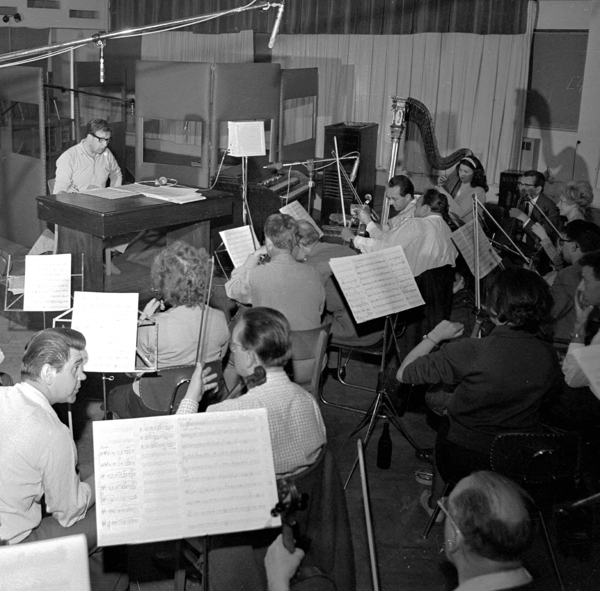 Josef Vobruba řídí Taneční orchestr Československého rozhlasu při nahrávání gramofonové desky | Foto: Josef Nosek, ČTK