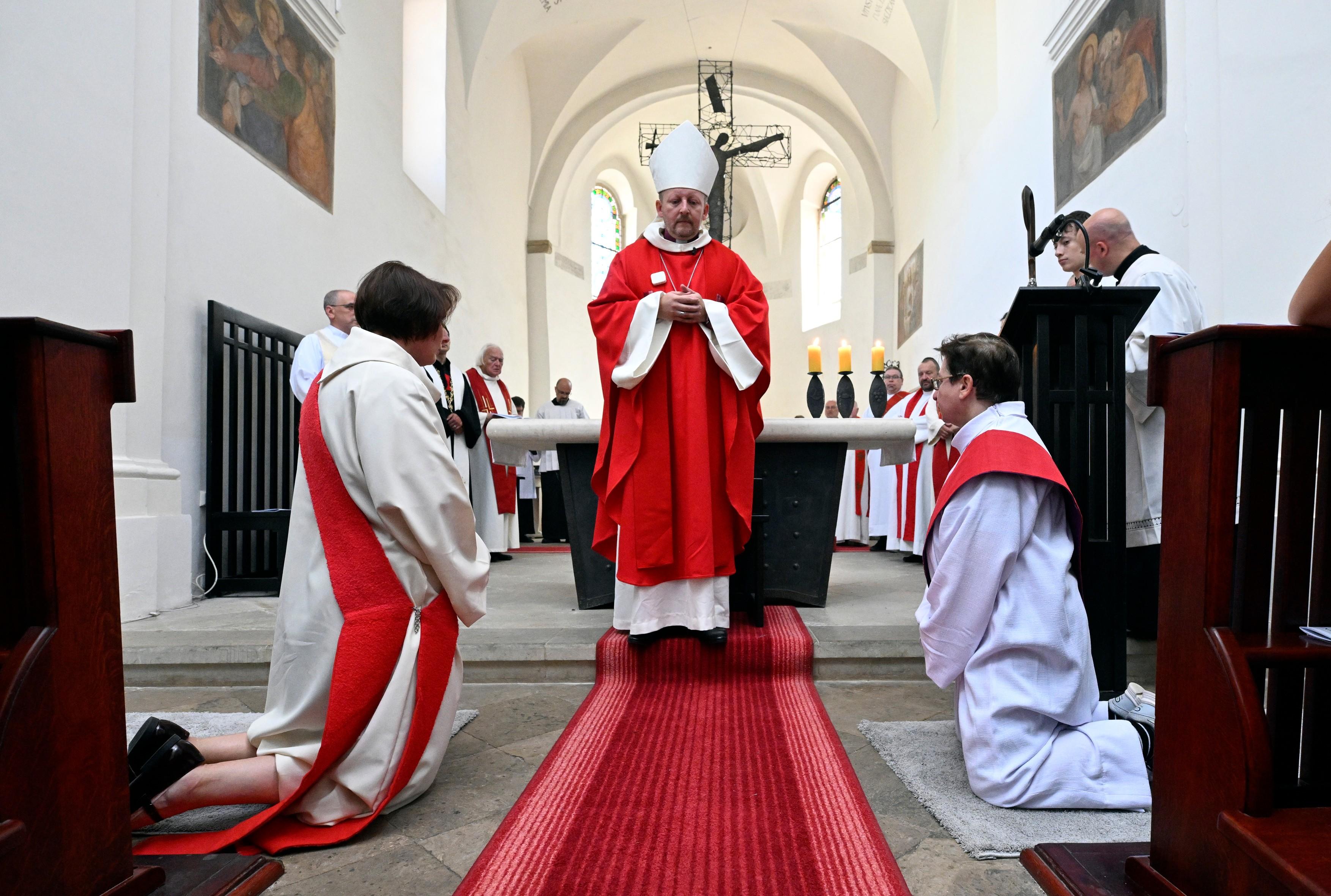 Biskup Starokatolické církve Pavel Benedikt Stránský udělil kněžské svěcení dvěma ženám - Darině Bártové z pražské farnosti sv. Máří Magdalény (vpravo) a Noemi Kosourové z farnosti Havlíčkův Brod (vlevo), 12. srpna 2023, Praha | Fotobanka Profimedia