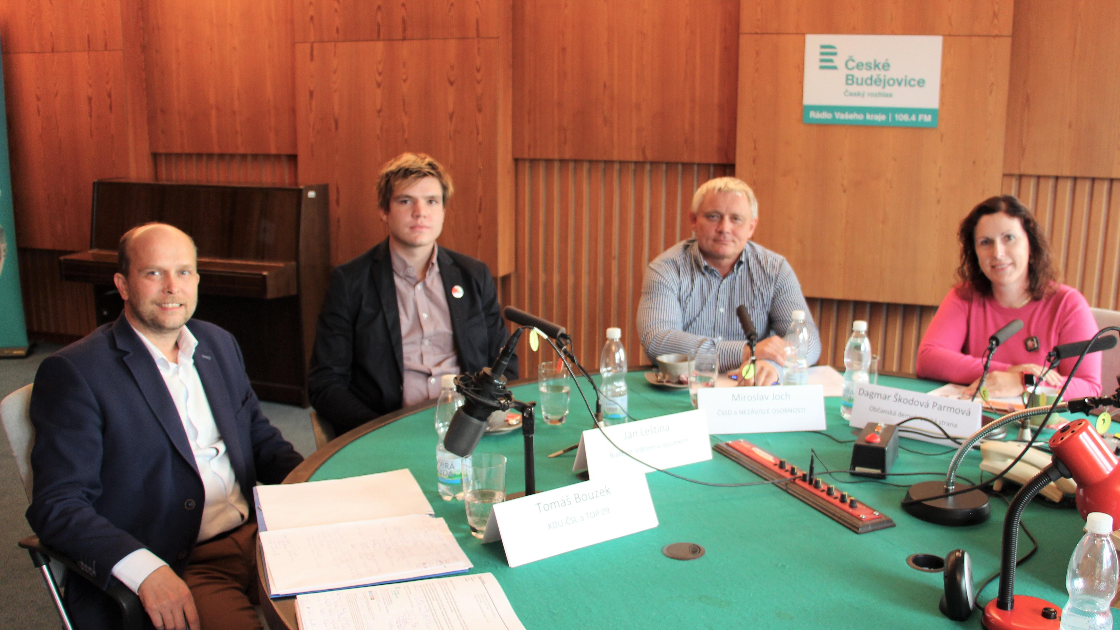 Účastníci druhé předvolební debaty v Českých Budějovicích: Tomáš Bouzek (KDU-ČSL a TOP 09 - Společně pro Budějovice), Jan Leština (Budějce srdcem a rozumem), Miroslav Joch (ČSSD a NEZÁVISLÉ OSOBNOSTI), Dagmar Škodová Parmová (Občanská demokratická strana) | Foto: Andrea Poláková, Český rozhlas