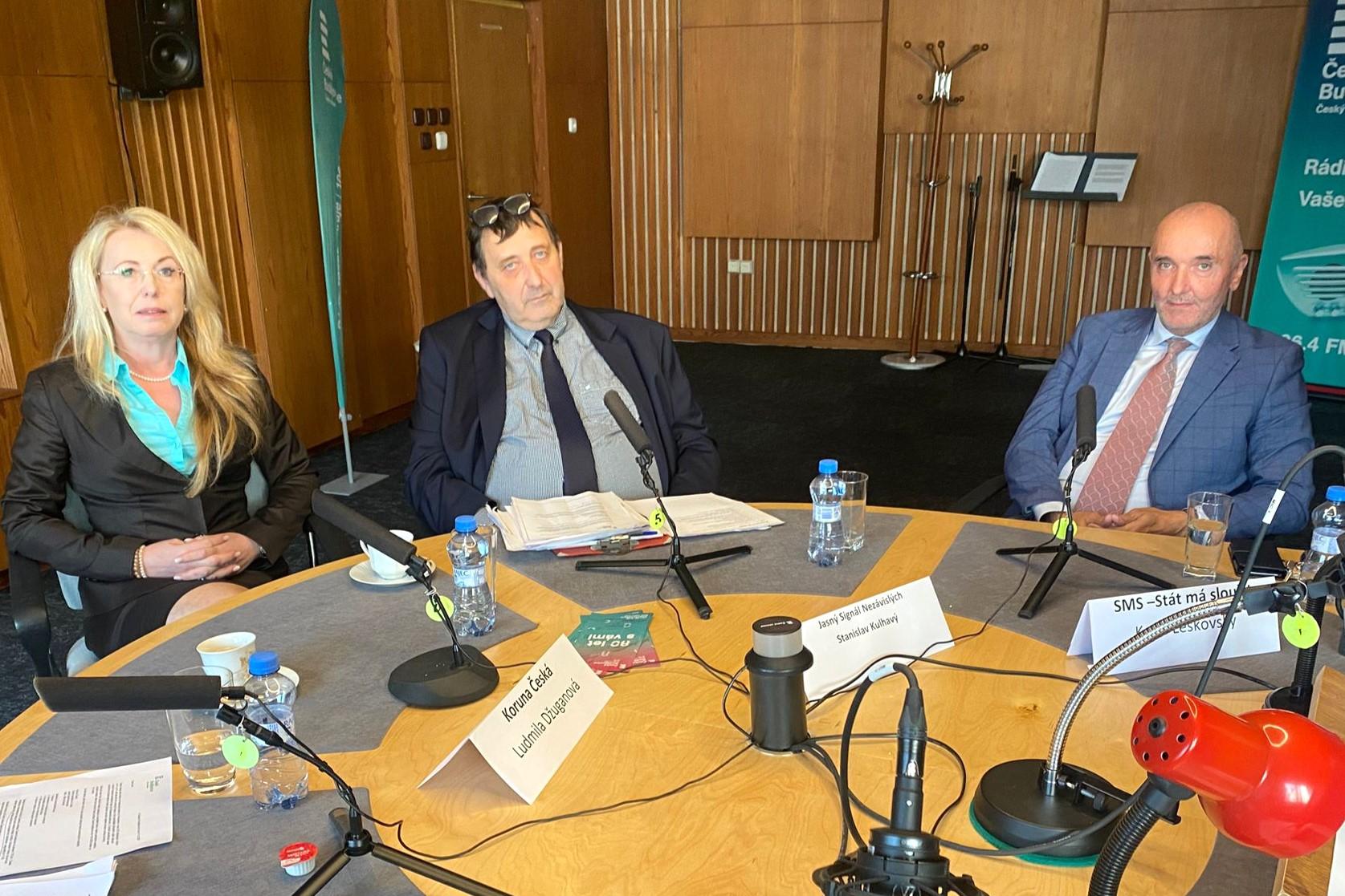Ludmila Džuganová (Koruna Česká – monarchistická strana Čech, Moravy a Slezska), Stanislav Kulhavý (Jasný Signál Nezávislých) a Karel Leškovský (SMS – Stát Má Sloužit) | Foto: Judita Šímová, Český rozhlas