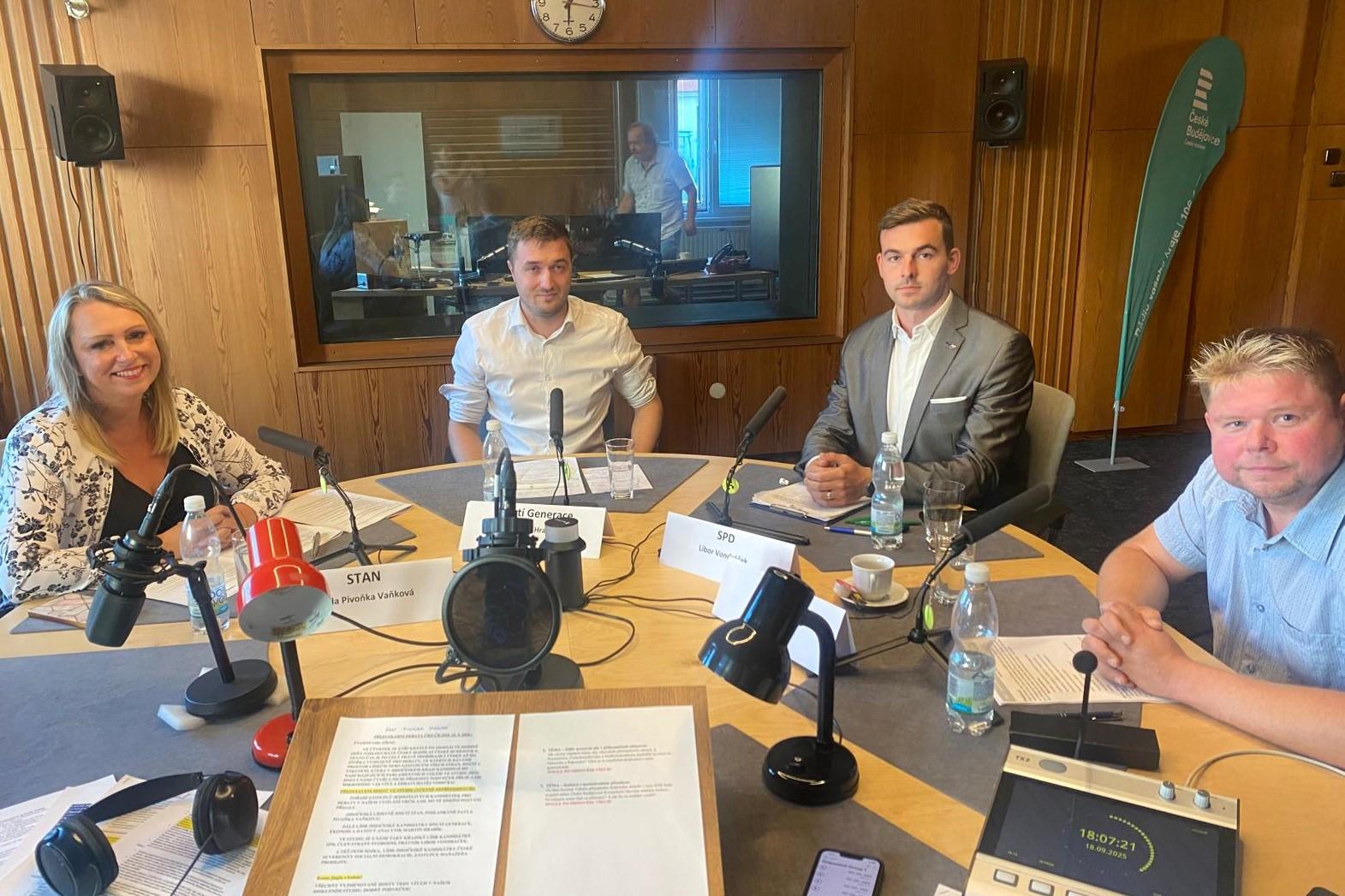 Pavla Pivoňka Vaňková (STAN), Martin Hrabík (Hnutí Generace), Libor Vondráček (SPD) a Petr Sojka (ČSSD – Česká suverenita sociální demokracie) | Foto: Judita Šímová, Český rozhlas