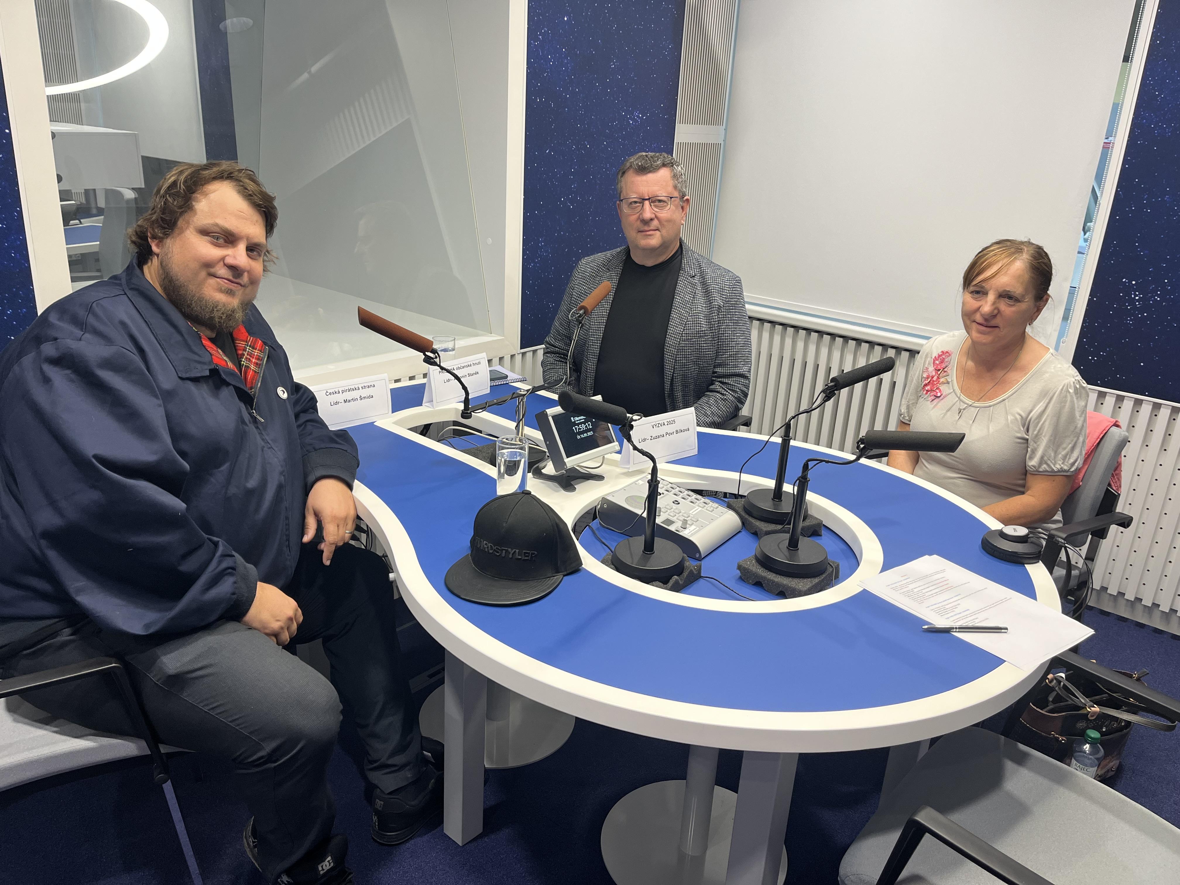 Do debaty přišli diskutovat Zuzana Povr Bílková (VÝZVA 2025), Antonín Staněk (Přísaha) a Martin Šmída (Česká pirátská strana).