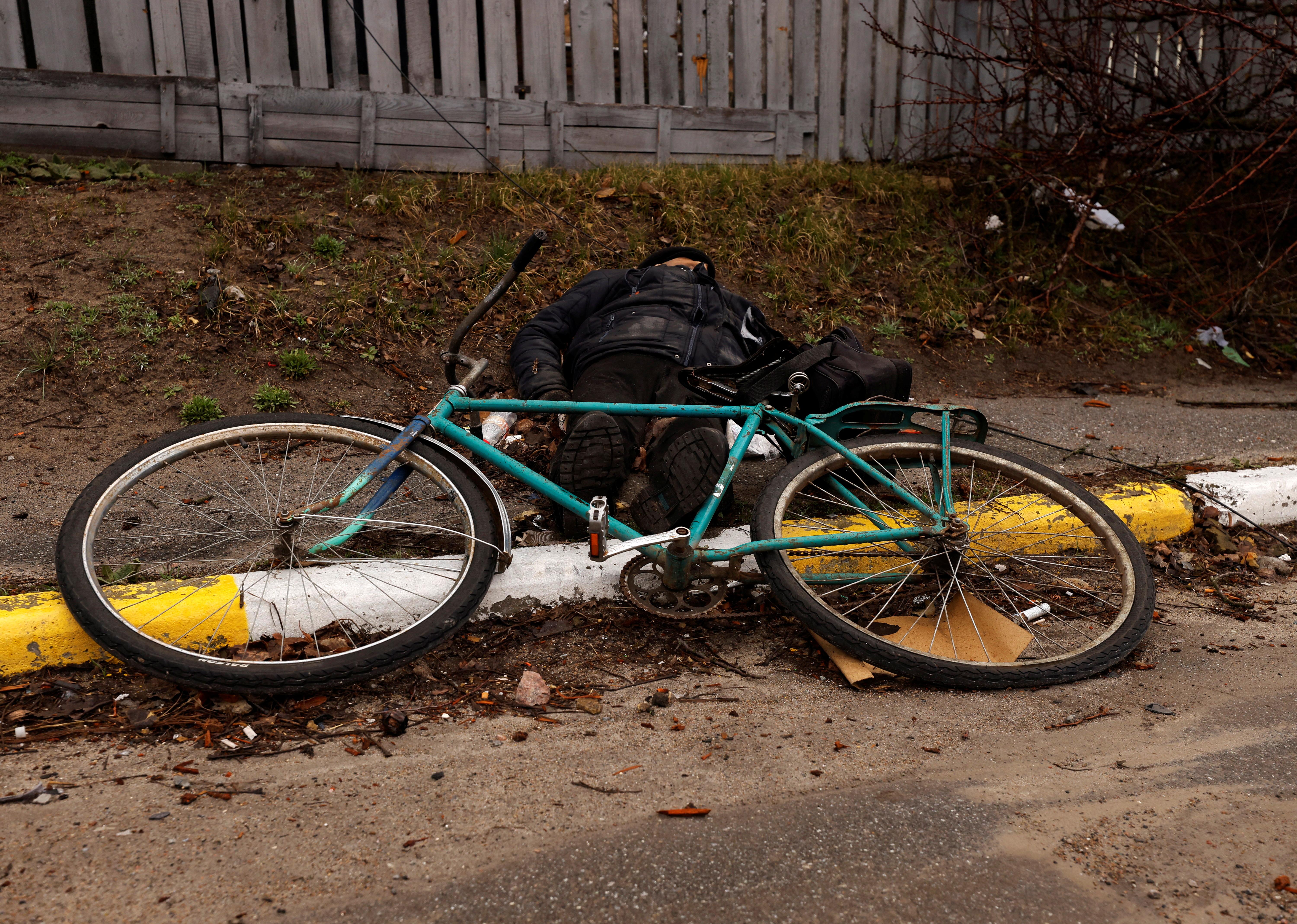 Mrtvý cyklista na ulici ukrajinského města Buča | Reuters