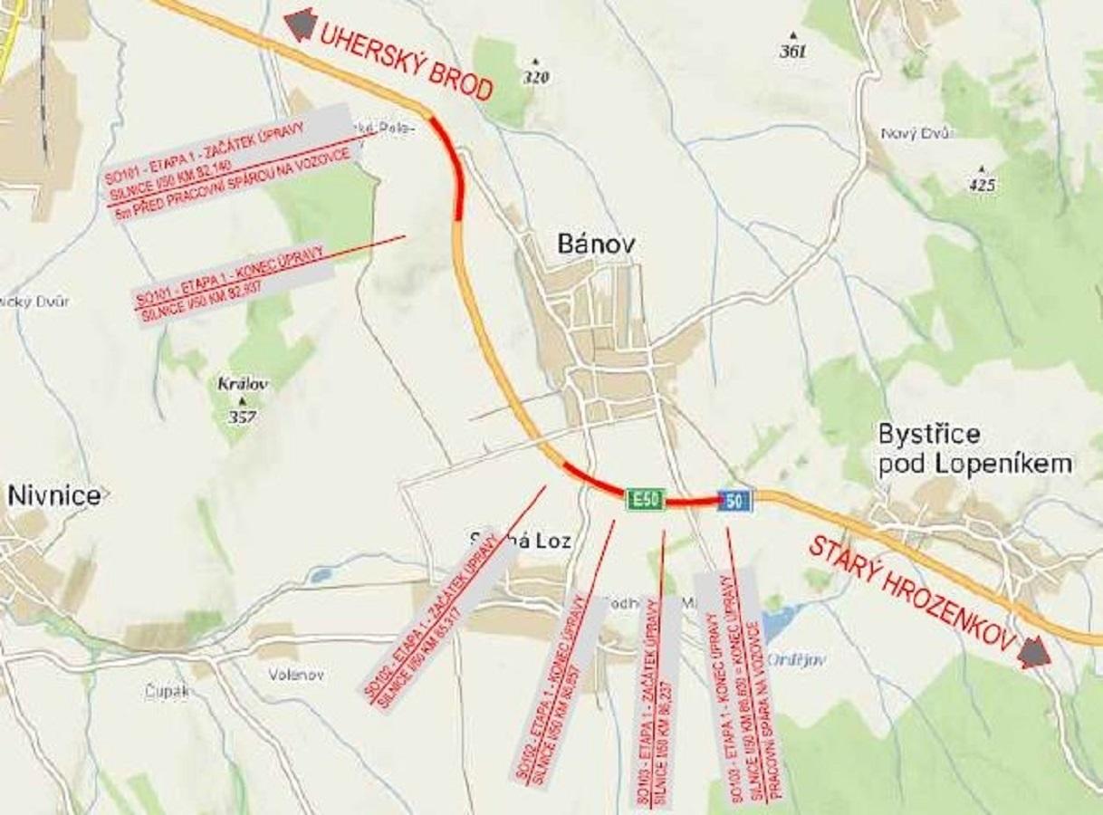 Silničáři od 21. října opravují povrch silnice I/50 ke slovenským hranicím u Bánova na Uherskobrosku. Řidiče tu čekají zdržení způsobená kyvadlovým provozem a uzavírkami některých odboček.